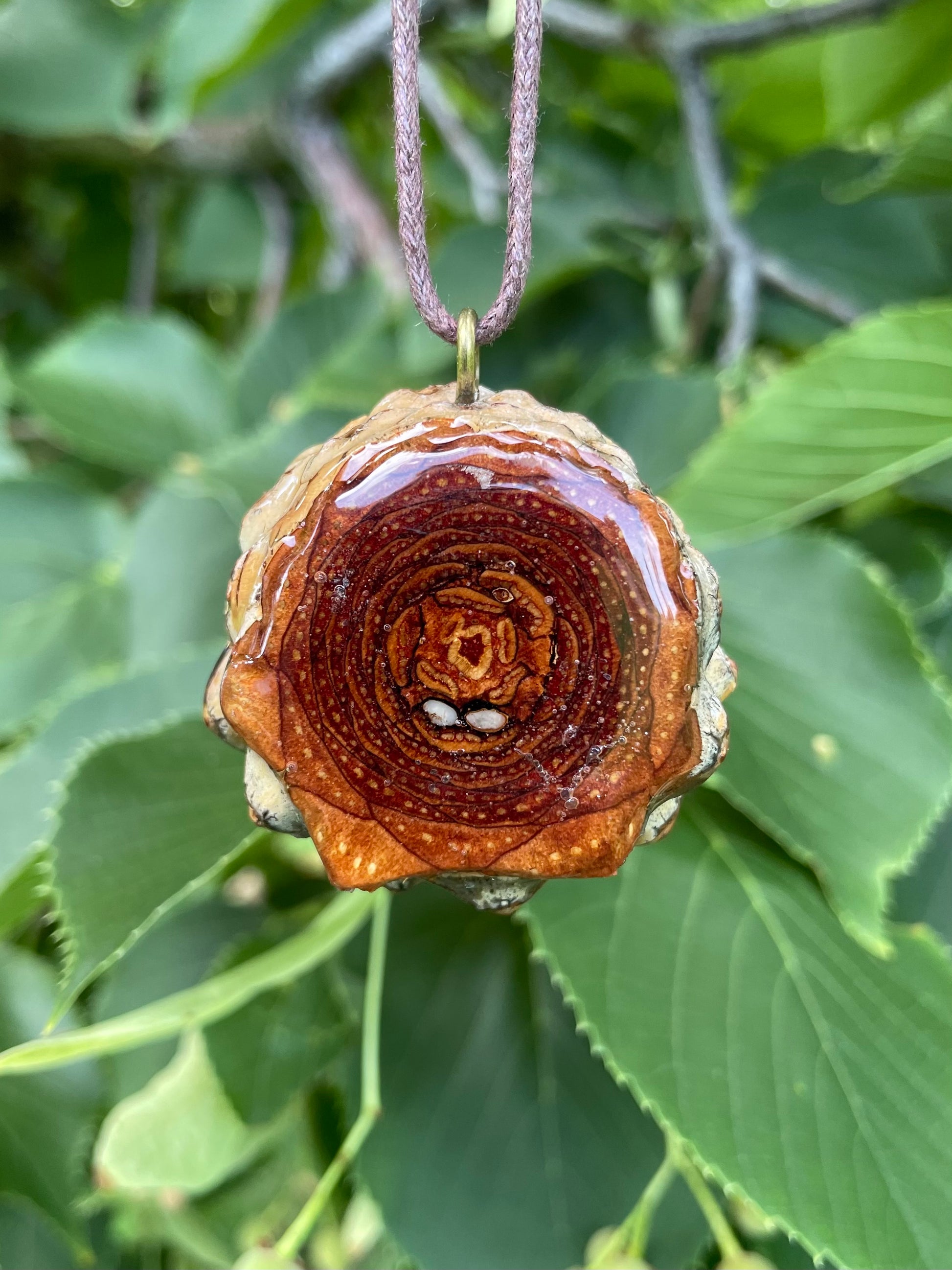 Suspended from an adjustable waxed cord, this pendant is both grounding and ethereal—a wearable reminder of nature’s symmetry and the harmony between earth and sky.